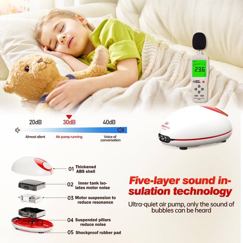 - Are you looking for a quiet aquarium air pump? Our product is your ideal choice. Compared with other air pumps on the market, it has excellent silent performance, produces almost no noise, and creates a quiet environment. It is suitable for placement in the bedroom, living room or office, and will not interfere with your life and work.