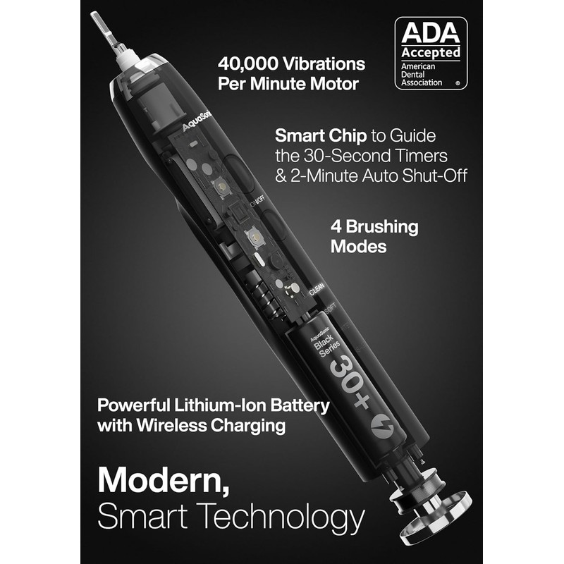 - Modern Tech for a Healthy Smile - Black Series brings toothbrushes into modern times with its built-in enhanced features. A lithium-ion battery, ultra-fast wireless charging (forget outdated USB charging), 4 distinct brushing modes and a smart vibrating notification timer are some of the enhanced features built into the sleek and ergonomic waterproof black satin handle.