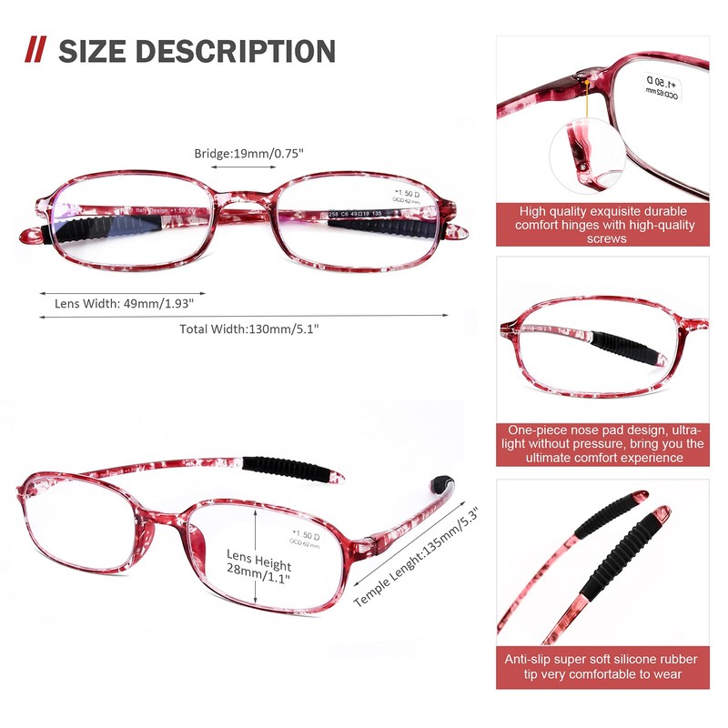 - [Lightweight and Flexible TR-90 Frames] The frames are made from the most advanced technology in TR-90 plastic, which makes them extremely durable and lightweight. They are flexible and can bend to the contours of your face, or comfortable enough to lay on your side with a pillow. So clear and comfortable when you reading you will enjoy your reading time