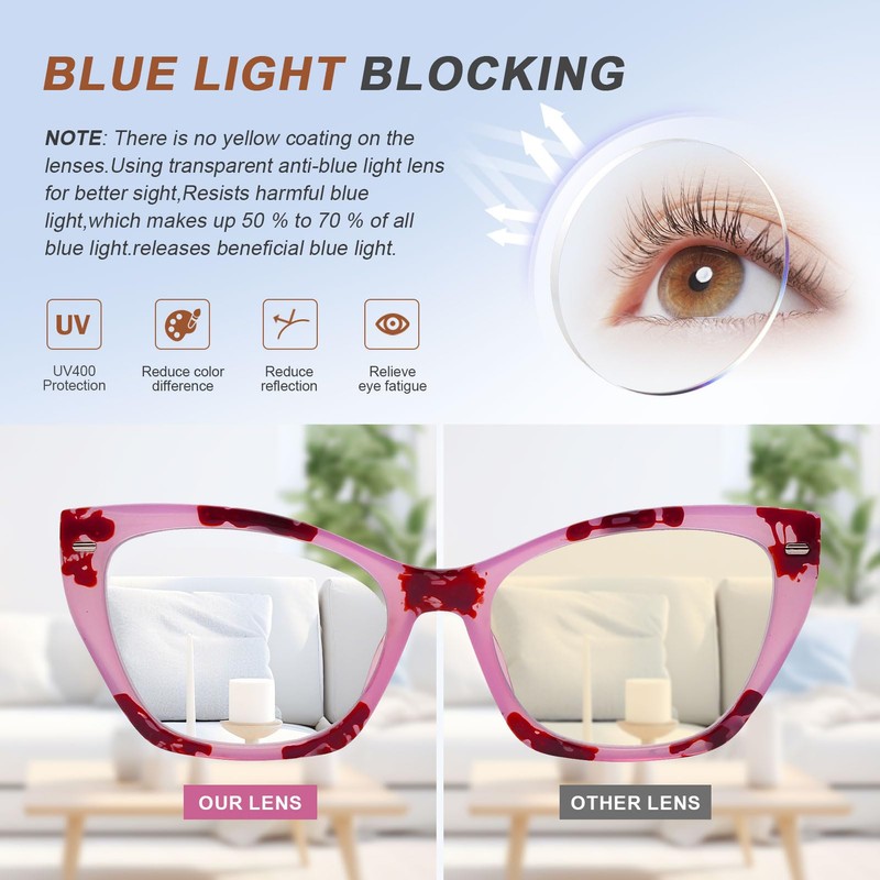 Our fashionable cat eye reading glasses feature advanced substrate-filtered blue light blocking lenses that: