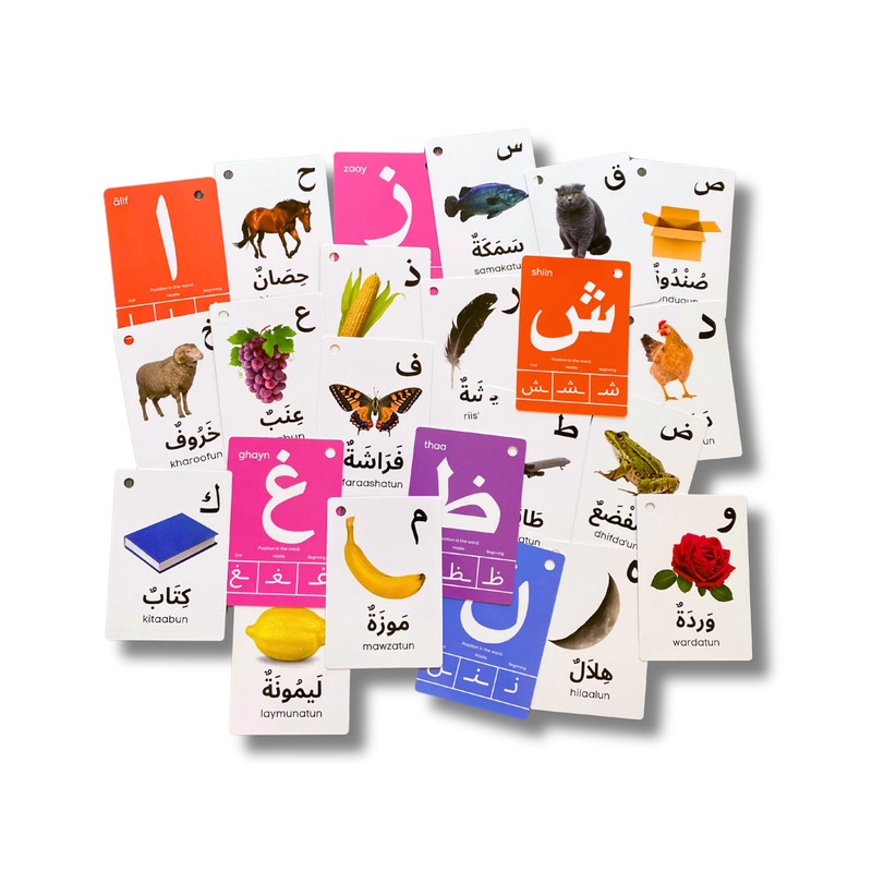 - Colorful, vibrant flashcards featuring the Arabic alphabet and common vocabulary words