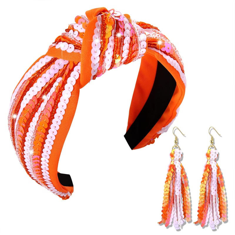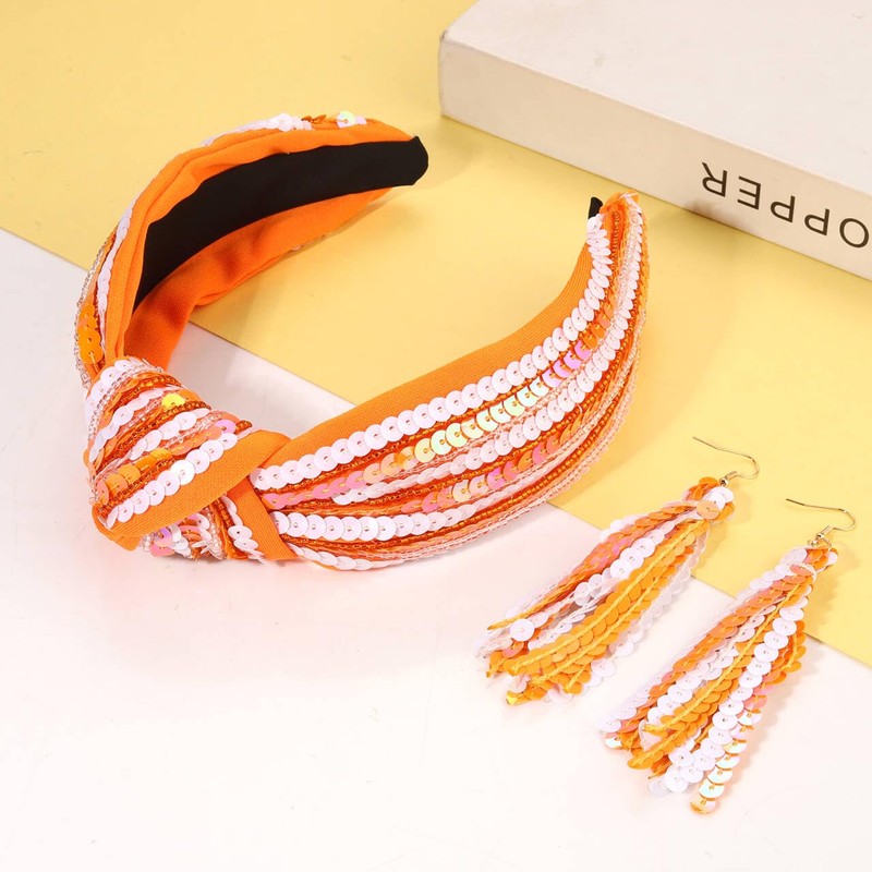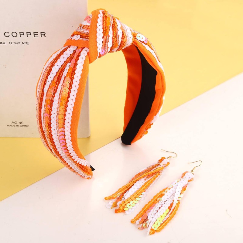 ARATLENCH Game Day Headband Football Team Spirit Orange White Sequins Earrings Football Mom Accessories Game Day Outfits for Women