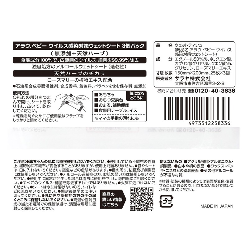 Arau Baby Virus Infection Prevention Wet Sheet, 25 Sheets x 3 Packs