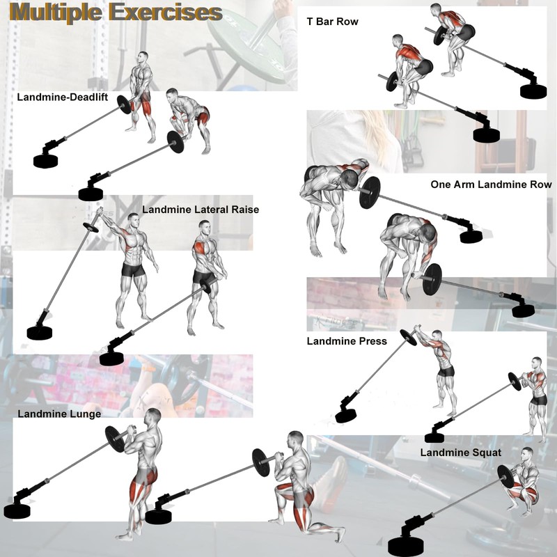 - Multiple Exercises of the T Bar Row Attachment:360° rotating features allows landmine attachment for barbell multiple workouts : squats, presses, rows, lunges, cleans and laterals, and various core exercises.Furthermore, the Landmine rows enables you to engage in a variety of training sessions while standing, in a high-kneeling position, and in a half-kneeling position.