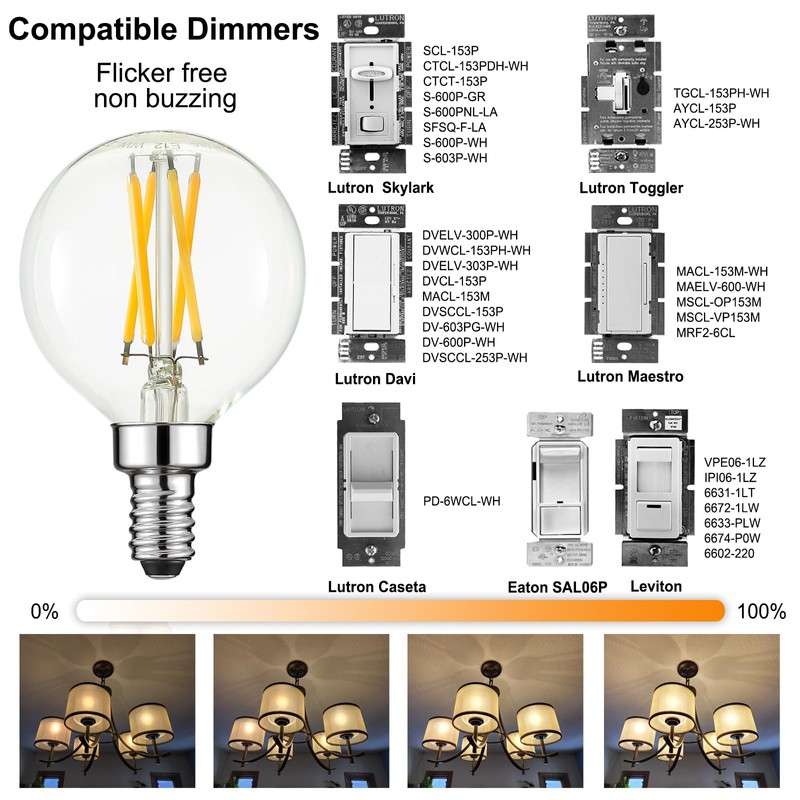 Free to Set Your Desired Brightness,E12 LED light bulb provide fully dimming control of the brightness;Candelabra base light bulbs dimmable 0%-100% and compatible with 95% Lutron and Leviton dimmers