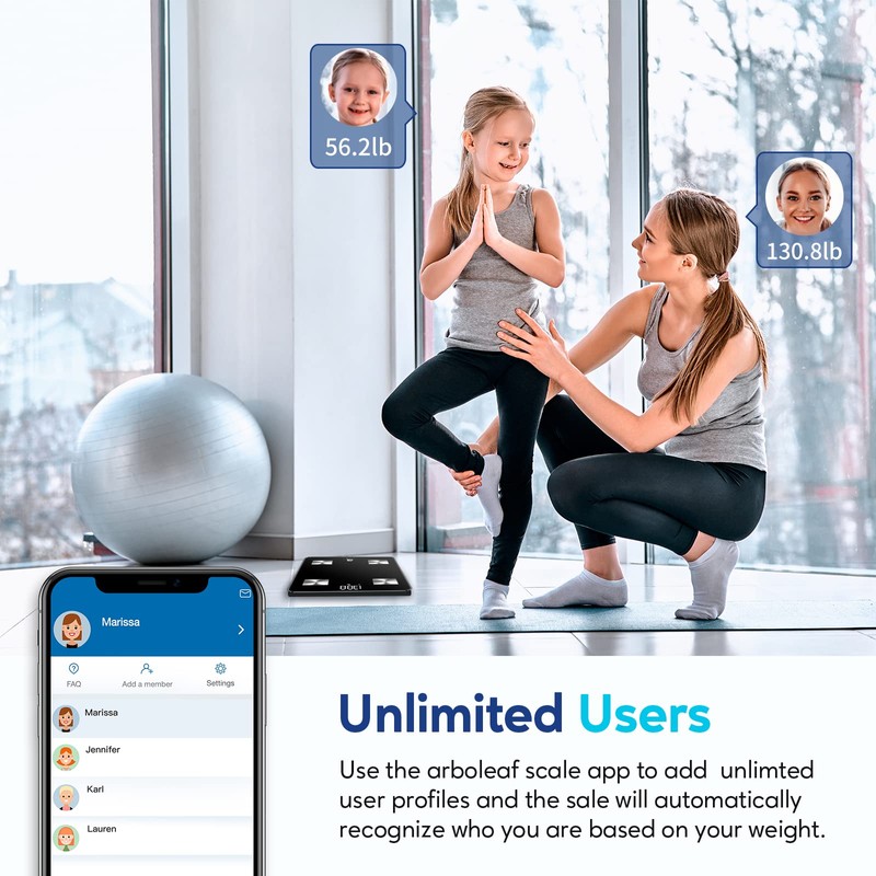 - Unlimited user profiles - Arboleaf weight scales for people enable add multiple user profiles, which means it can intelligently identify every user and match its historical data, which allows whole family members to share the same scale for body weight and fat percentage.