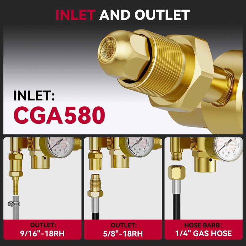 - INLET CONNECTOR: CGA-580, includes a filter that removes impurities, extending the lifespan of the gas pressure gauge and improving welding quality.