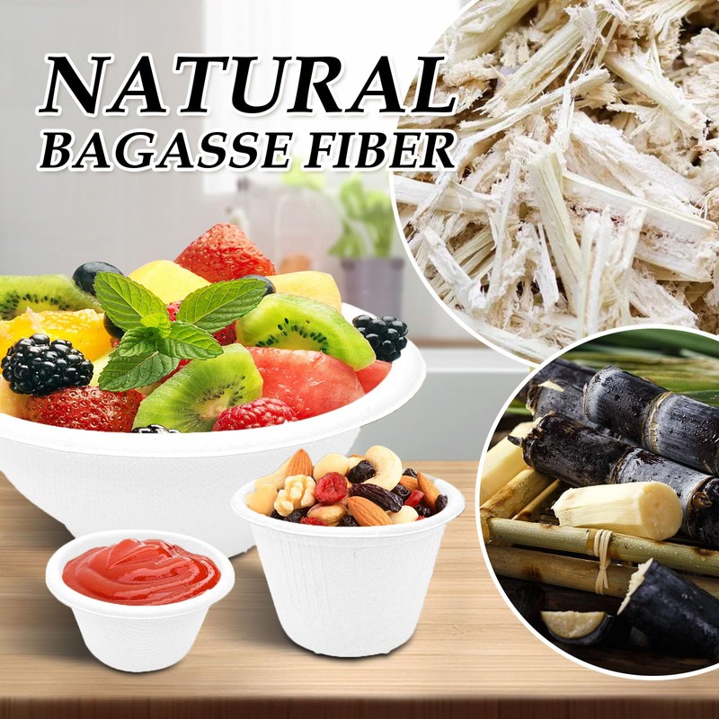 - Disposable bagasse bowls can hold sample snack, ice cream, salad, soup, dessert, sauce, condiment, drinks, water, chili sauce. It is widely used.