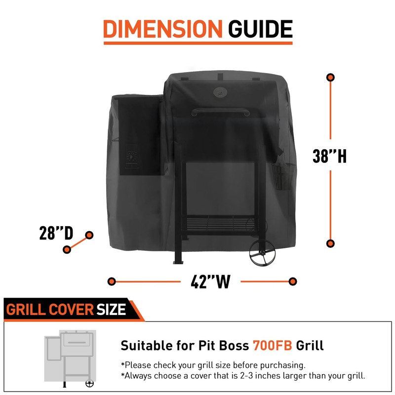 - PELLET GRILL COVER SIZE - Measures 42" W x 28" D x 38"H, the Arcedo wood pellet grill cover is compatible with popular brands of pellet grills, such as Pit Boss 700FB (73700), Classic 700, Pro Series 600, Lexington 500, Lexington 540, 440FB, PB Tailgater, RT 340 Trailblazer and Patio Legend 410, etc. * Please double check the cover size and model number on your grill before purchasing.