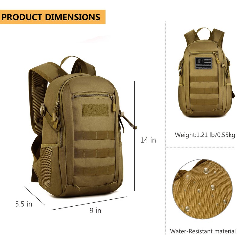 ArcEnCiel 12L Small Tactical Backpack Military MOLLE Daypack Gear Assault Pack Camping Bag (Coyote Brown)