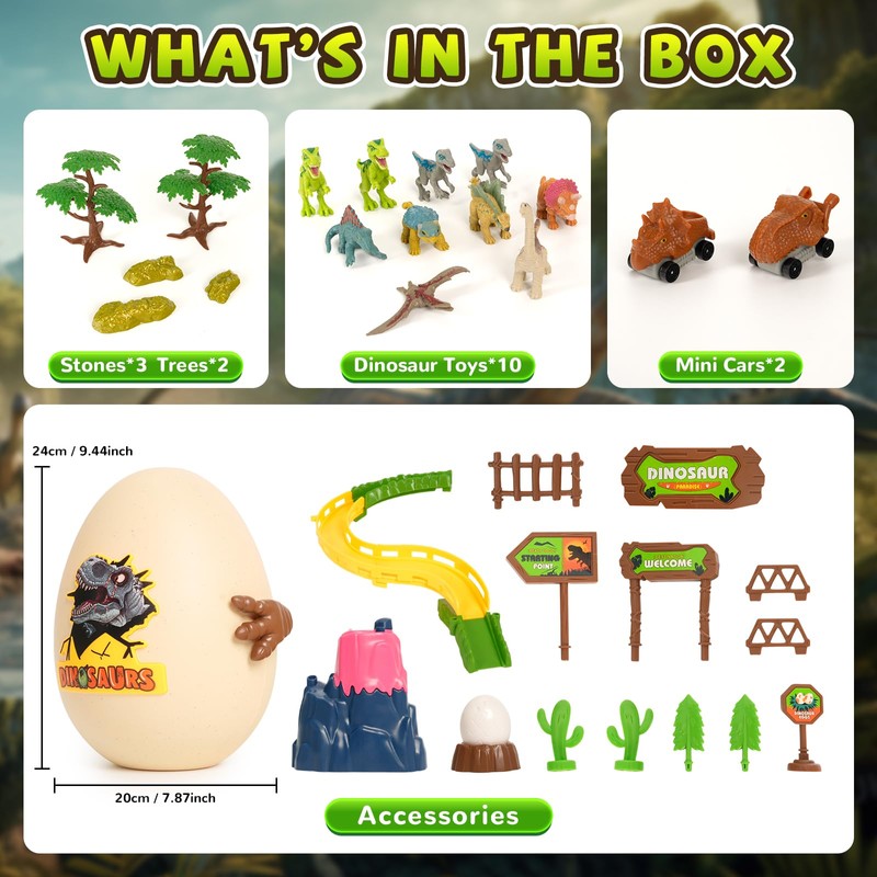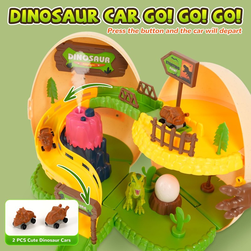 - Fun Dinosaur Egg Toys : Experience endless fun with dinosaur games - simply unfold the track, press the button, and the dinosaur cars take off! Experience a thrilling adventure with a real volcano eruption, realistic smoke and sound effects, immerse yourself in a prehistoric journey like never before