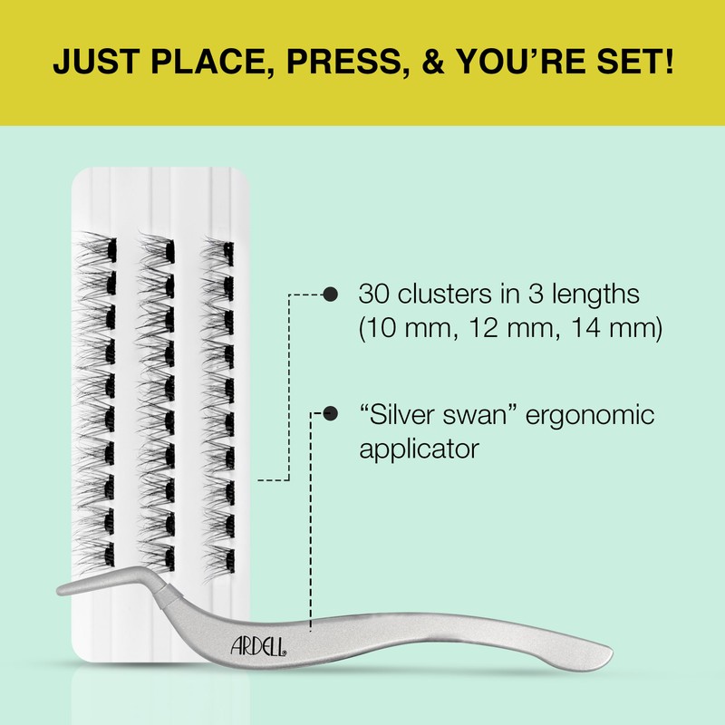 - Pre-Glued Underlash Extensions: Ardell’s pre-glued underlash clusters for wearing sleek lashes while saving you time and effort. Comes in 3 different lengths per pack: 14 mm 12mm 10mm. Includes a quality lash applicator.