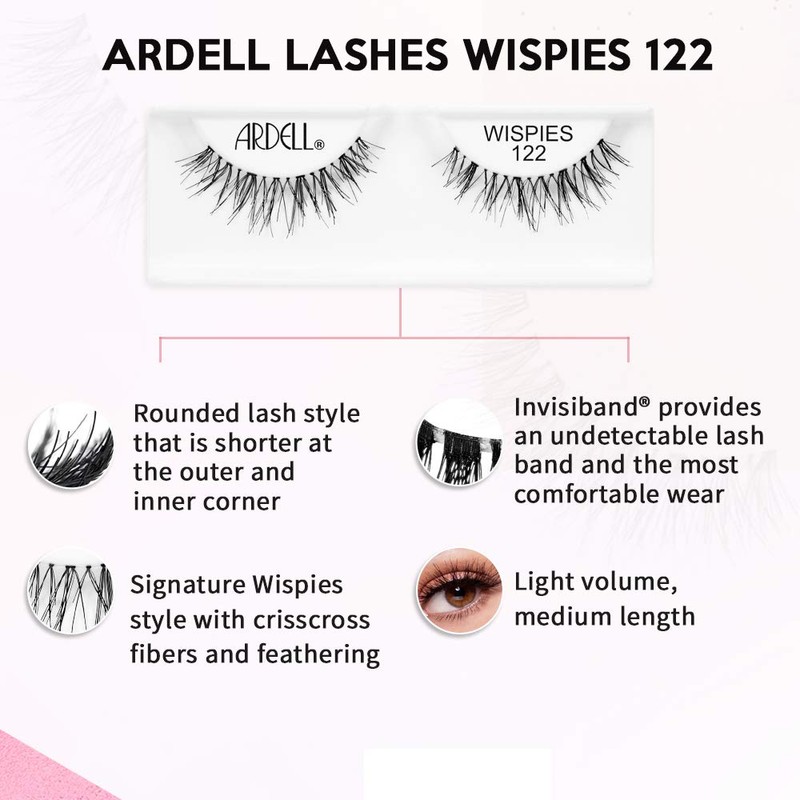 • LIGHTWEIGHT, INVISIBLE FAKE LASHES FOR ALL OCCASION: The Ardell False Eyelashes Wispies 122 Black includes patented Invisiband Technology so your lashes feel oh-so-comfortable and look perfectly natural. Comfortable to wear and lightweight, these beautiful wispies have medium length and light volume for understated definition. These falsies will draw attention to your eyes with extra fullness, suit every occasion to always get you party ready!