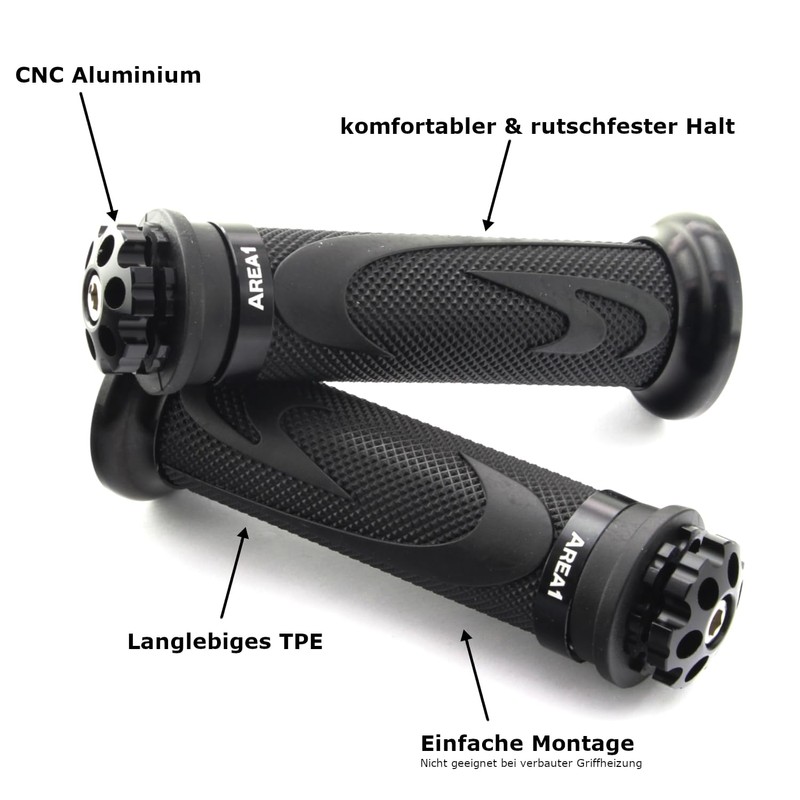 - Universal motorcycle and scooter handlebar grips from the German brand Area1 stand for the highest possible quality in combination with modern designs. This handlebar grip series offers numerous highlights and guarantees an ultimate eye-catcher on your vehicle: