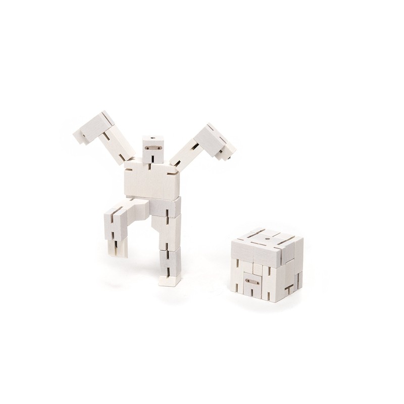 Robot toys are usually made of plastic and require batteries. Not this one! Inspired by Japanese Shinto Kumi-ki puzzles, the Cubebot is a non-traditional take on the toy robot. Cubebots's powerful hardwood frame can hold dozens poses, and his elastic-band muscles and durable wood limbs make him impervious to breakage. When it's time for him to rest, he folds into a perfect cube. An enduring classic that will withstand generations of play.
