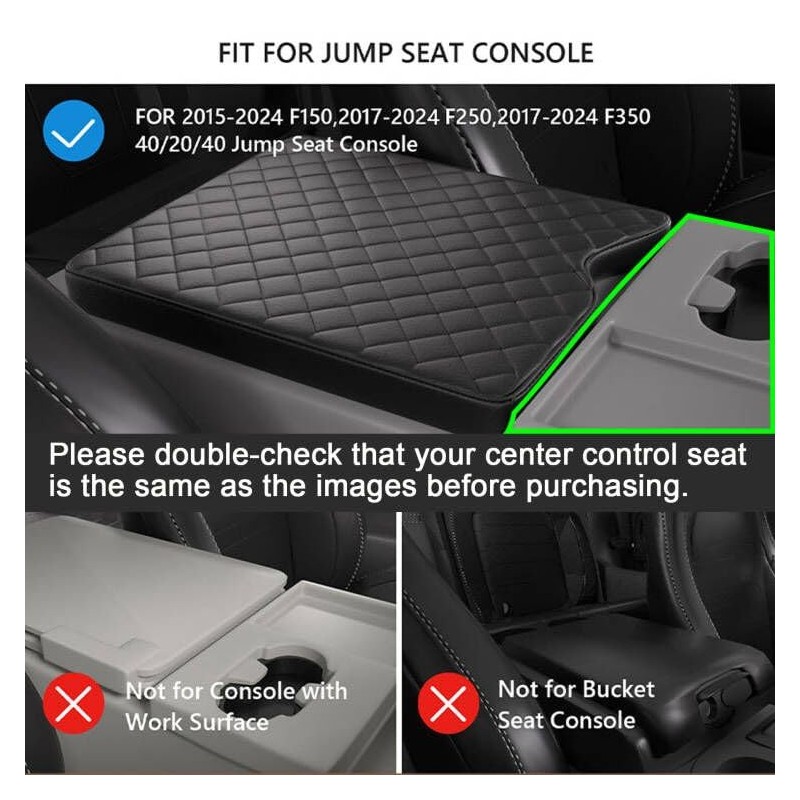 - 【Perfect Fit】The Center Console Cover is specially customized for 2015 2016 2017 2018 2019 2020 2021 2022 2023 2024 2025 Ford F150 accessories,2017 2018 2019 2020 2021 202202023 2024 2025 F250 F350 F450 F550 with 40/20/40 jump seat console. Fits perfectly like a glove on car armrest. Note:The jump seat armrest cover are not suitable for bucket seatconsoles and consoles with work surfaces.