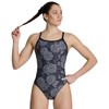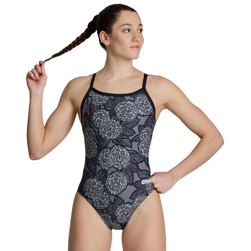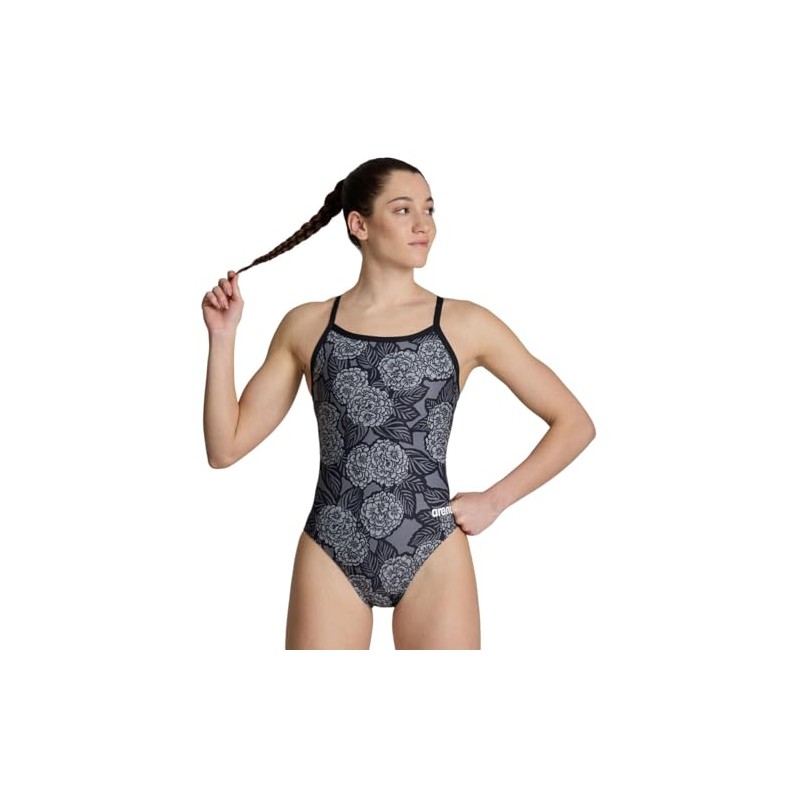ARENA Women's Hydrangea Bouquet Challenge Back-Chlorine Resistant Swimwear for Competition, Race Training,Black-Team Black