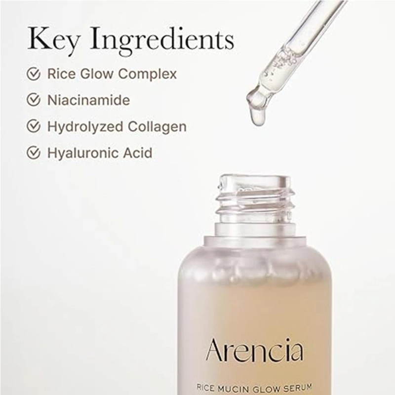 Suitable for all skin type. Made to reduce the appearance of dark spots and give the skin a natural glow, the Arencia Rice Mucin Glow Serum combines natural ingredients with a scientifically backed formula, leaving the skin plump and luminous. This natural yet potent rice serum combines rice ferment filtrate with niacinamide, collagen and hyaluronic acid.