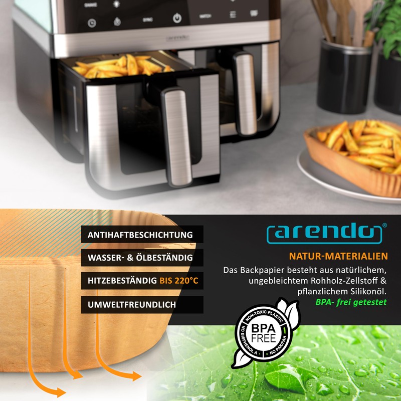 - For delicious food and a clean hot air fryer. Arendo baking paper ensures evenly cooked food that is easy to remove. Thanks to the non-stick coating, nothing sticks and excess fat is efficiently absorbed. The result: no residue in the hot air fryer and a particularly quick cleaning. | Bulk pack of 100; BPA free and food safe according to LFGB. | 307150