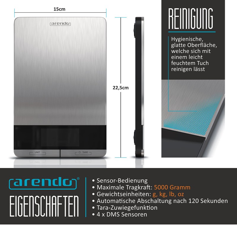 - Arendo Stainless steel kitchen scales with hygienic weighing surface and touch sensor operation. Smooth surface, easy to clean. Maximum load capacity: 5000 grams. Base area: approx. 22.5 x 15 cm. | 303591