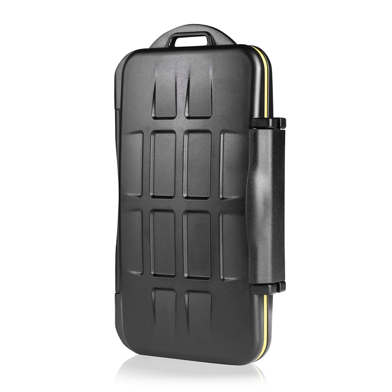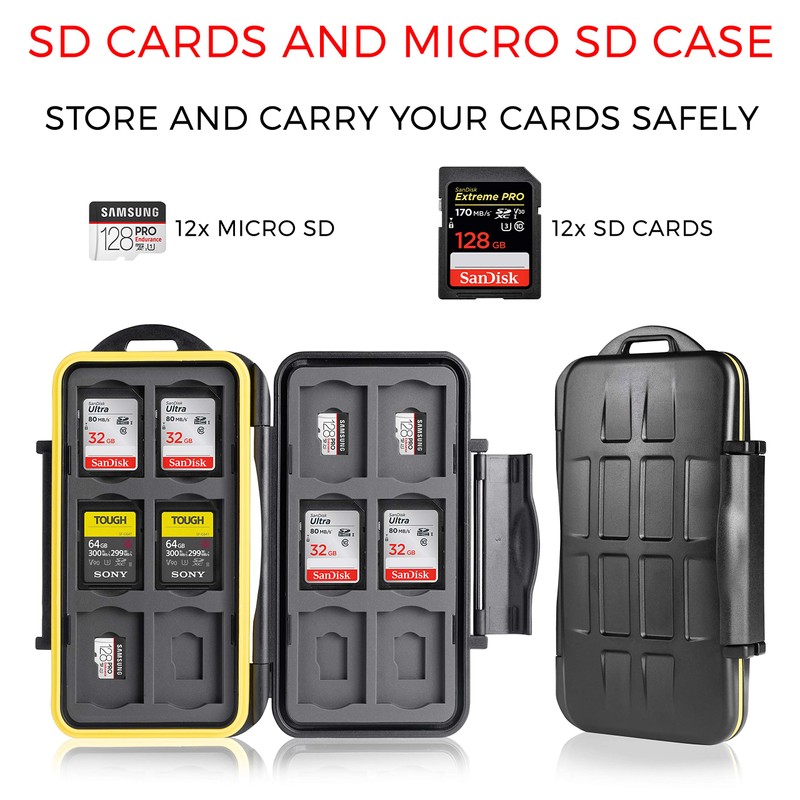 - Shockproof and waterproof plastic case for up to 24 memory cards. For 12 SD, SDHC or SDXC cards as well as 12 MicroSD cards. ABS plastic housing and shock-absorbing rubber inserts. Ideal for safely transporting and storing the inserted cards