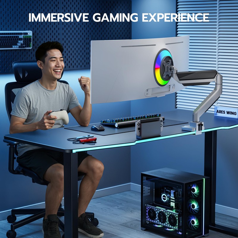 - Effortless Comfort, Built to Last - The ARES WING monitor arm is equipped with a built-in gas spring system that delivers smooth, controlled adjustments based on your monitor’s weight. Whether you’re fine-tuning the viewing angle or transitioning between tasks, the arm moves with consistent stability and precision—no sudden shifts or resistance. Designed for long-lasting durability and safety, it ensures a secure hold and a more comfortable, ergonomic experience every time you use it