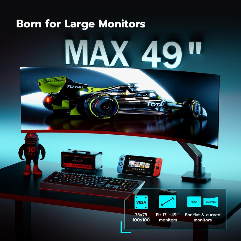 - 【Support up to 49" & 44lbs Monitors】The 49 inch monitor arm supports most flat, and curved computer screens ranging from 17 to 49 inches, holding 4.4 to 44 lbs. Compatible with Samsung Odyssey G9, LG, and other 49" ultrawide monitors, but needs to prepare a VESA mount adapter if your monitor does not have VESA holes. Equipped with 75x75mm and 100x100mm VESA mounting holes.
