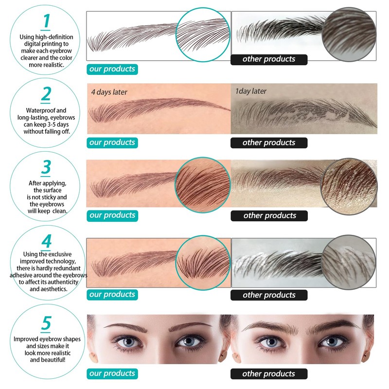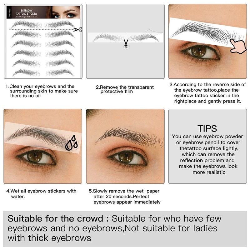 - Long Lasting & Easy to Locate --- The girl fake eyebrow tattoo is made of high-quality material, not easy to fall off, not easy to fade, use properly they can even stay up to 3-5 days. Each eyebrow sticker has the same eyebrow shape at the back, which can be compared to find a suitable position when the eyebrow tattoo is attached, and present the best effect.