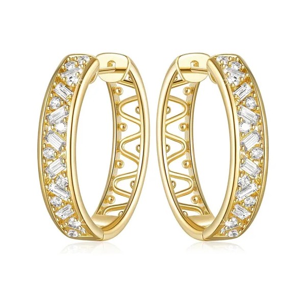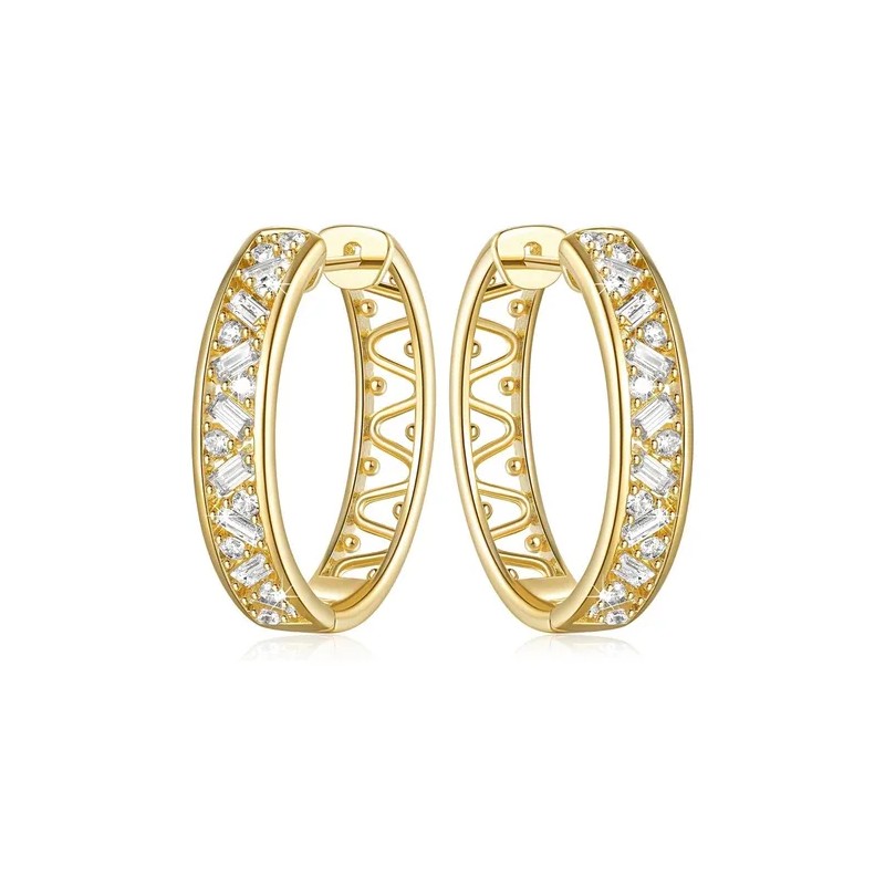 Estos impactantes aretes de oro 14K combinan el lujo del diseño clásico con un toque moderno gracias a su incrustación de zirconias en corte mixto baguette y redondo. La estructura de 5.5mm de grosor garantiza presencia sin excesos, mientras que la altura de 25mm los posiciona como una opción elegante pero cómoda para el día a día.