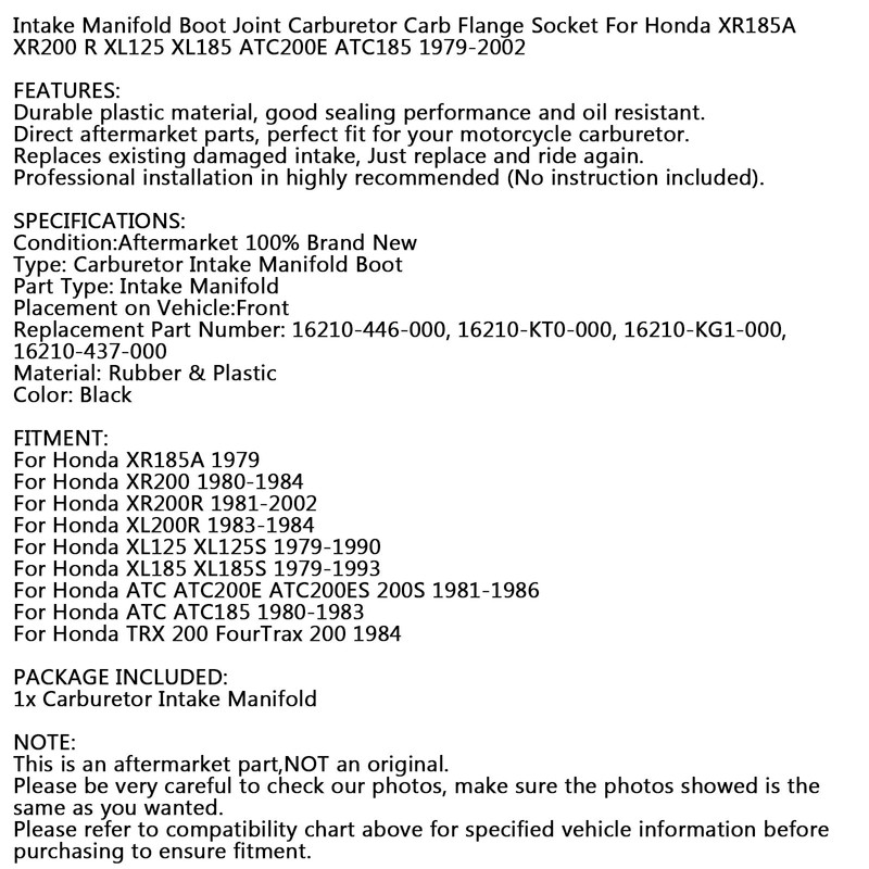 Areyourshop Carburetor Flange Carb Boot for XL125 XL185 ATC 185/200 TRX200 XR200 XL200