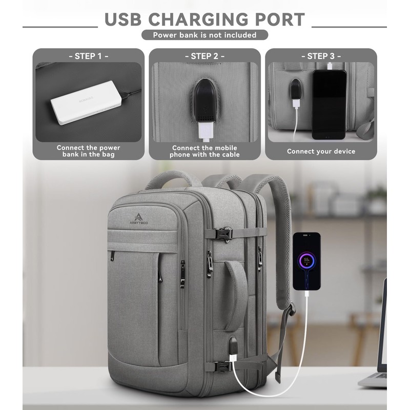 - đăUSB Charging Port & Headphone HoleăCarry on backpack built-in USB Charging Port and headphone outside hole design. This travel backpack is convenient to charge your phone(Note: POWER BANK is not included). Headphone jack provide a hole to enjoy the music while walking.