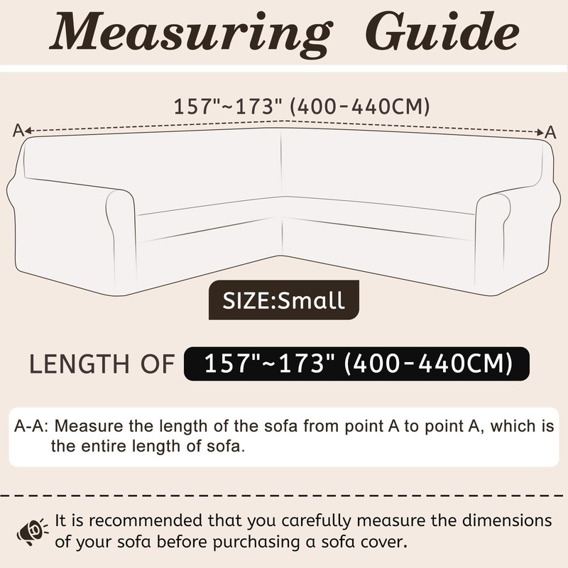 • Size: The u shaped sectional couch covers is designed to stretch, extra-large size is accommodate sofas measuring 209-232 inches, large size is accommodate sofas measuring 189-209 inches, medium size is accommodate sofas measuring 173-189 inches, and small size is accommodate sofas measuring of 157-173 inches. Please measure your sofa carefully before purchase