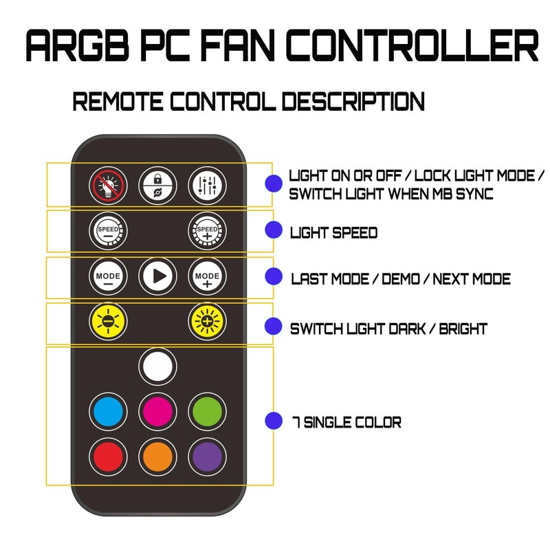 - 【17 Keys Remote Control PC Fan Controller】 The ARGB017 argb controller come with a 17 keys remote control, it can control rgb fan light off and on, light speed, light bright, rgb light demo and single light.