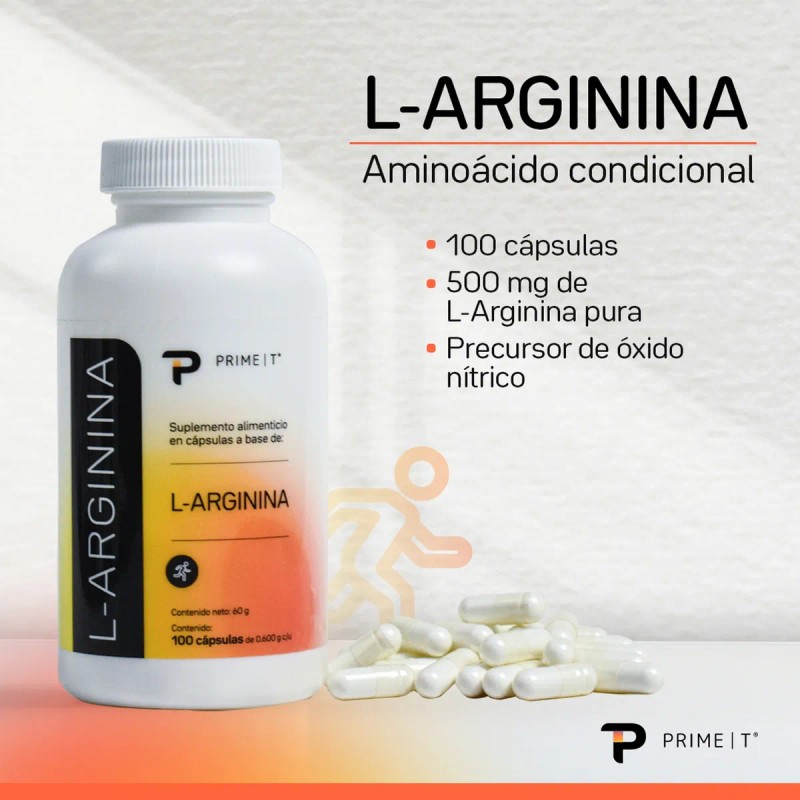 Arginina Cápsulas De 500 Mg L-arginina Primetech De Alta Pureza Y Calidad que Se Convierte En Óxido Nítrico, Dilata Los Vasos Sanguíneos y permite un mejor flujo de sangre y oxigenación