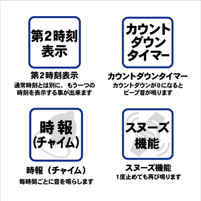 - Functions: Automatic correction of radio waves (ON/OFF setting), solar panel, alarm, snooze function, hourly time signal, stopwatch, split time and lap time measurement, countdown timer, 12/24 hour display, second time display, EL backlight