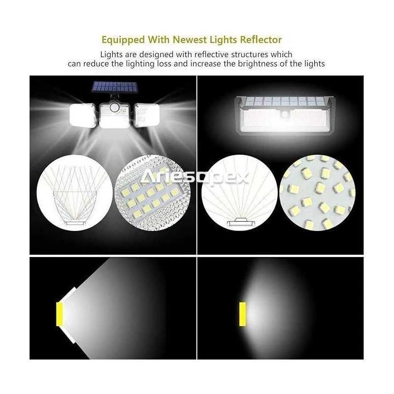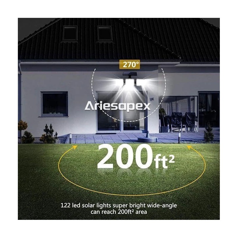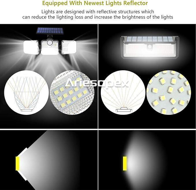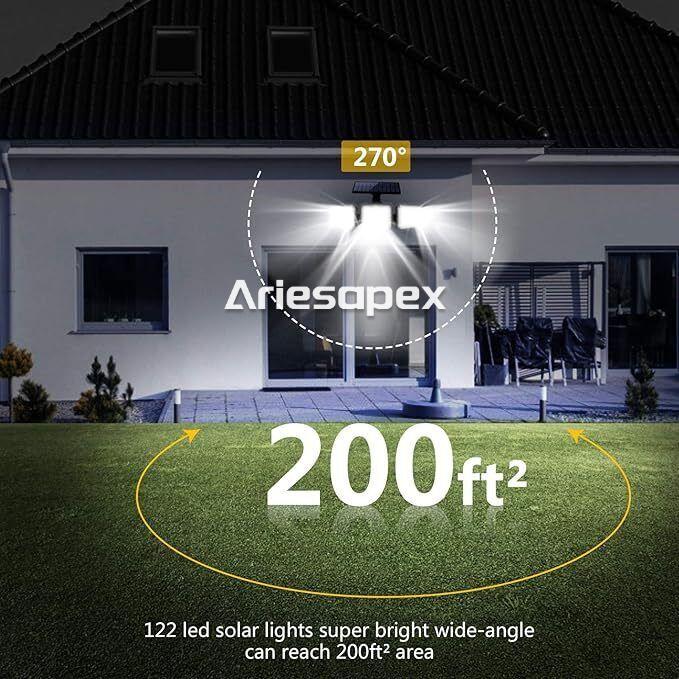 Brighter & 270° Wide Lighting: solar lights Interior equipped with 122pcs high power LED lights, which is far brighter than other similar lights,the solar flood lights with 3 adjustable light heads,easy to adjust the light heads,lens hoods and motion sensor to different angles as your requirement,capture 270° wide lighting angle.