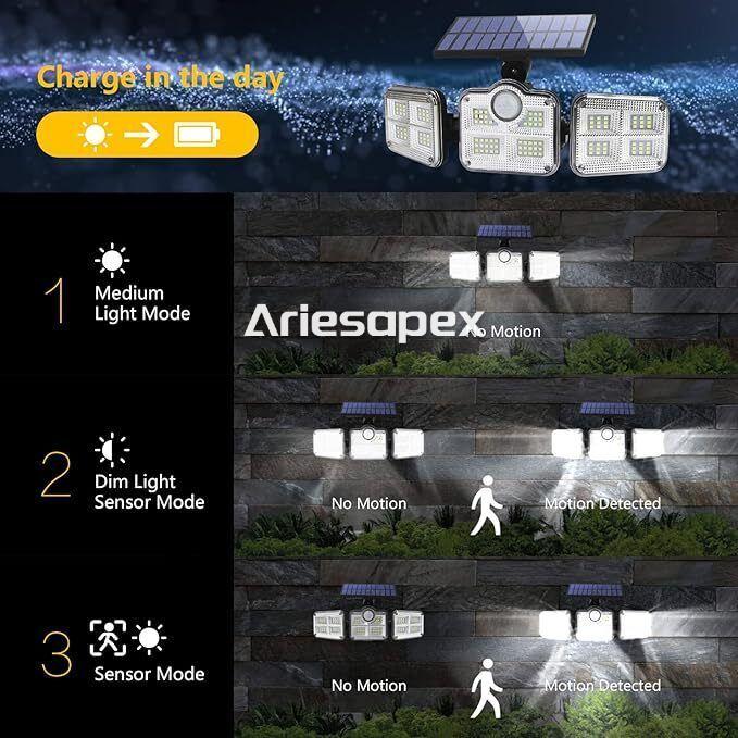 3 Lighting Modes: motion activated solar light has 3 lighting modes : Mode 1( Sensor Mode ): the light turns on when it detects movements and off 20 sec after the person leaves; Mode 2( Dimmable Sensor Control ): the light turns on in dim mode at night and brightens for 20 sec when it detects motion; Mode 3( Always Light ): It always turns on at night and stays medium light with or without detecting motion.