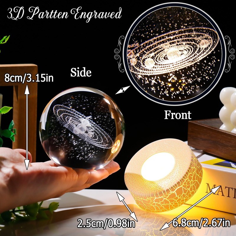 - Warm Light Base and Specification: Every crystal ball is equipped with a warm light base. The material of the base is plastic, the base matches a wire which has switch. When you turn on the light, the base can emit a charming warm light, and the 3D solar system becomes more clear and vivid, especially at night, and can be used as a night light. Easy use the USB cable to connect with the computer, car, or portable charger or use a charging plug(Don't include a plug in the package)