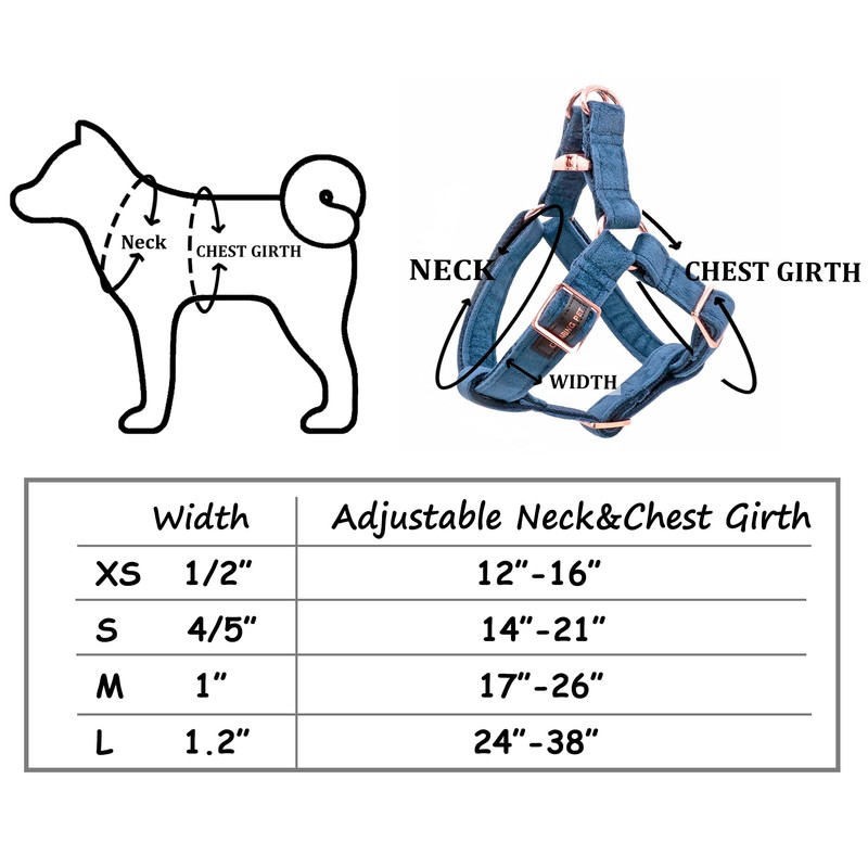 WELL MATERIAL: The harness ia made of velvet, it is very soft and comfortable, At the same time, velvet is also smooth texture and colorfast. It will not hurt the dog.