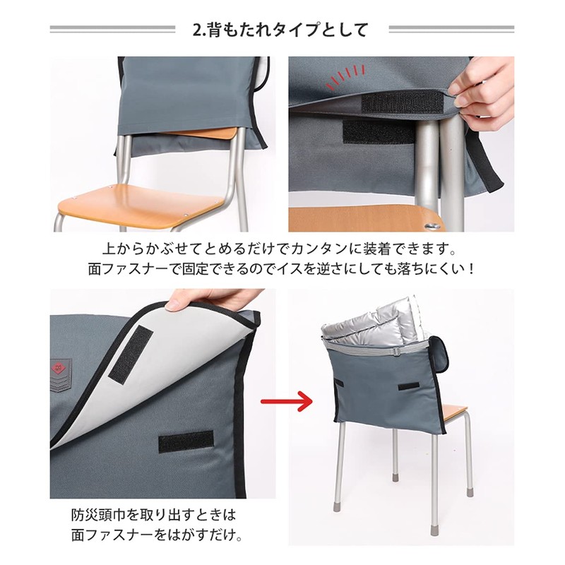 - Can be used as a backrest or as a seat cushion. Convenient 2-way disaster preparedness cover *This is a cover only. Disaster prevention cap is not included