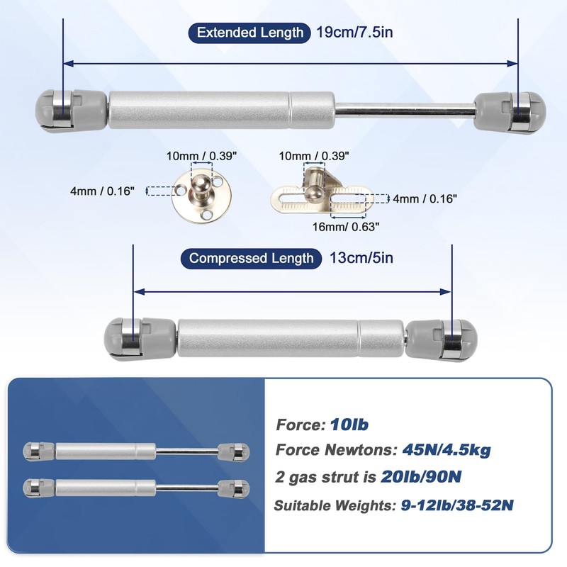 - 7.5 Inch Gas Struts:Extend Length: 7.5 inch, Compressed Length: 5.25 inch; Force: 10lbs/ 45N/ 4.5kg; Support Weight: between 9~12lbs (38~52N).
