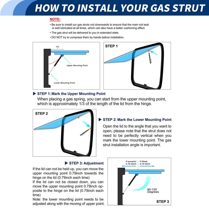 Step 3: Adjustment If the lid can not be held up, you can move the upper mounting point 0.79inch towards the hinge on the lid (0.79inch each time).If the lid can not be closed down, you can move the upper mounting point 0.79inch opposite to the hinge on the lid (0.79inch each time)