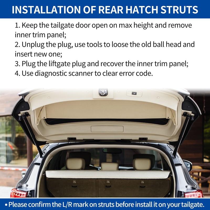 - How to Install: 1. Keep rear gate door open on max height and remove inner trim panel; 2. Unplug the plug, use tools to loose the old spherical joint and insert new one; 3. Plug the liftgate plug and recover the inner trim panel; 4. Use diagnostic scanner to clear error code, just use scanner to clear if show negative/occasional; replace the lift struts if show permanent. Confirm the L/R mark on struts before install it on your tailgate.