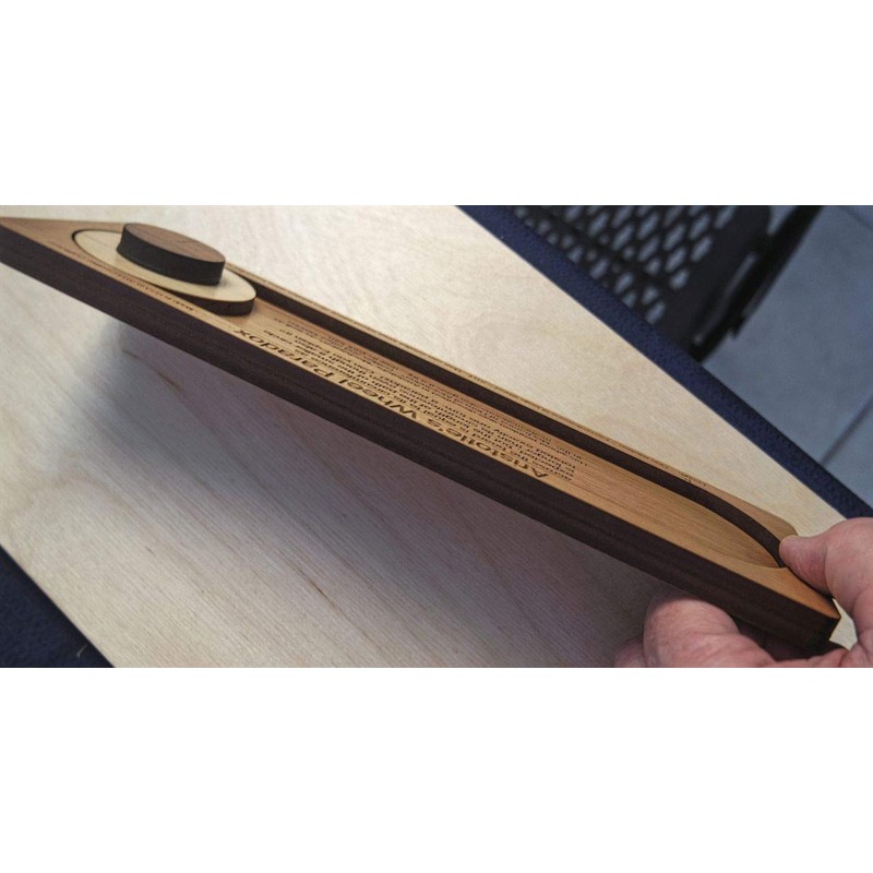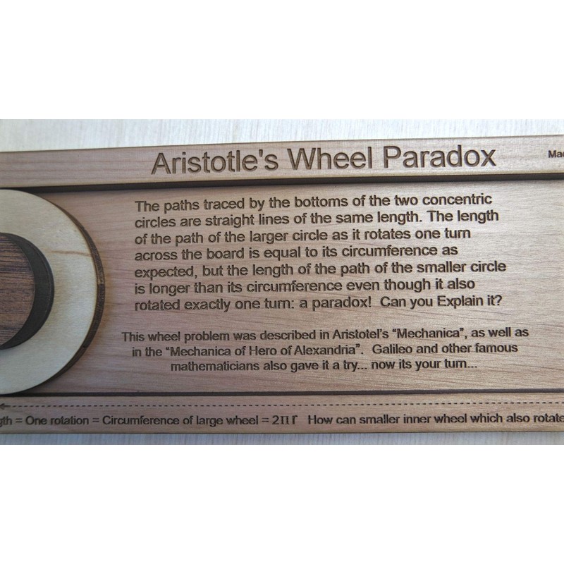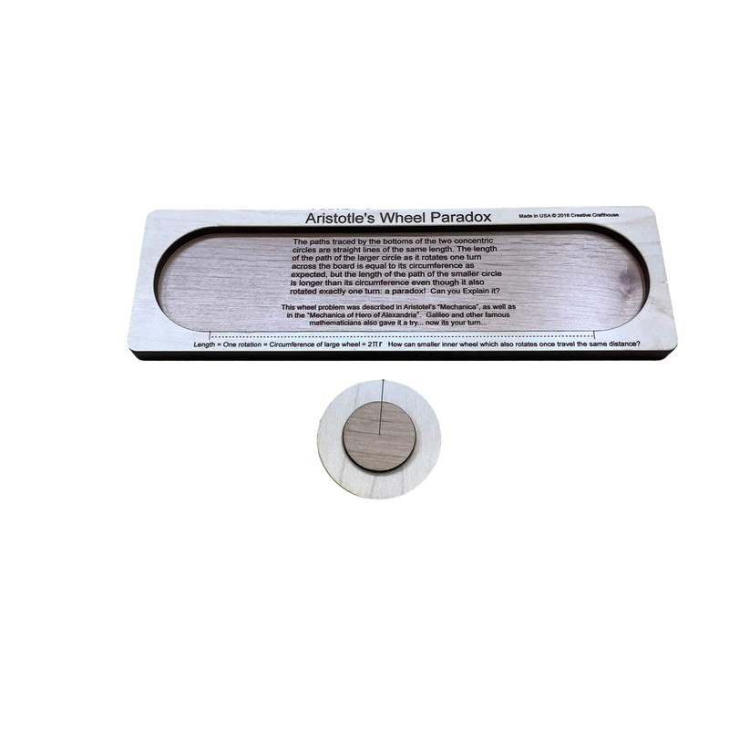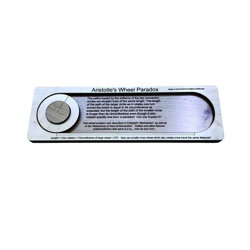 How can 2 wheels of different diameter both turning one complete revolution travel exactly the same distance? This paradox is nicely demonstrated using this wood model. Aristotle took a whack at this in the Aristotelian Mechanica, as well as in the Mechanica of Hero of Alexandria and Galileo gave it a try as well. The paradox involves two different-sized wheels, one inside another. The two rotate in sync and you can see as you turn the wheels to travel the length of the opening in the puzzle that the etched line on the wheels turns one time, thus the circumference of each wheel has rotated over an equal length. Both wheels use exactly one circumference to trace the same amount of distance - the length of the space in the puzzle. But, clearly one circumference is smaller than the other. Either that means that the wheels have the same circumference, which they don't, or that different circumferences "unroll" to the same length, which they can't. That can't possibly be right.... The smaller radius can't possibly be equal to the larger one, so what's going on? To further illustrate the paradox, I have included an separate copy of the inner wheel. We know that when attached to the bigger wheel that it turns one rotation to cover the length of the opening starting at the hash mark. But now take the small wheel and position it at the same starting point and rotate one revolution.... it does not travel the same distance! Such a dilemma.... Can you explain it?? Made in our Hudson FL shop