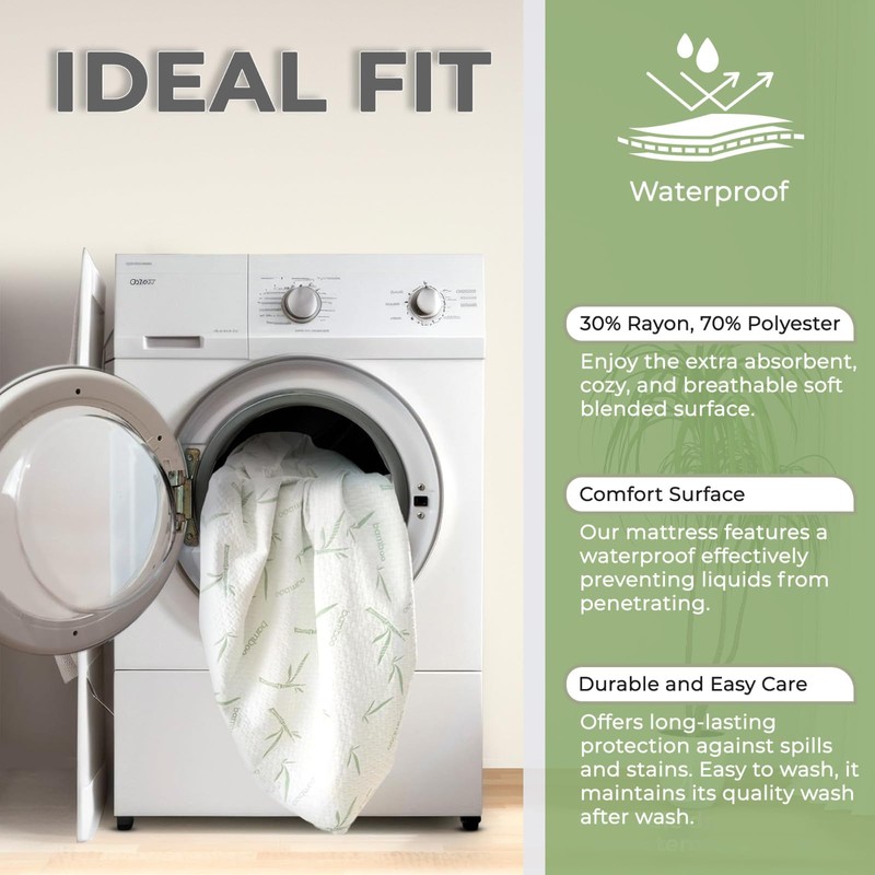 • Rest and Care: Our full mattress protector is designed to keep your mattress in top condition. Crafted from bamboo-derived rayon, it is soft to the touch and suitable for sensitive skin, ensuring a restful night.