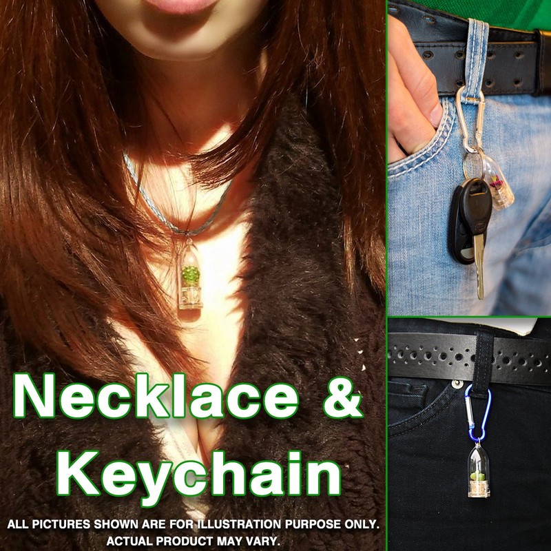 Terrarium plant that is a perfect accessory for your key-chain, cell phone, backpack, rear view mirror or any other place where you desire a bit of freshness. You can also remove the top capsule from the base and build yourself a miniature desktop garden.