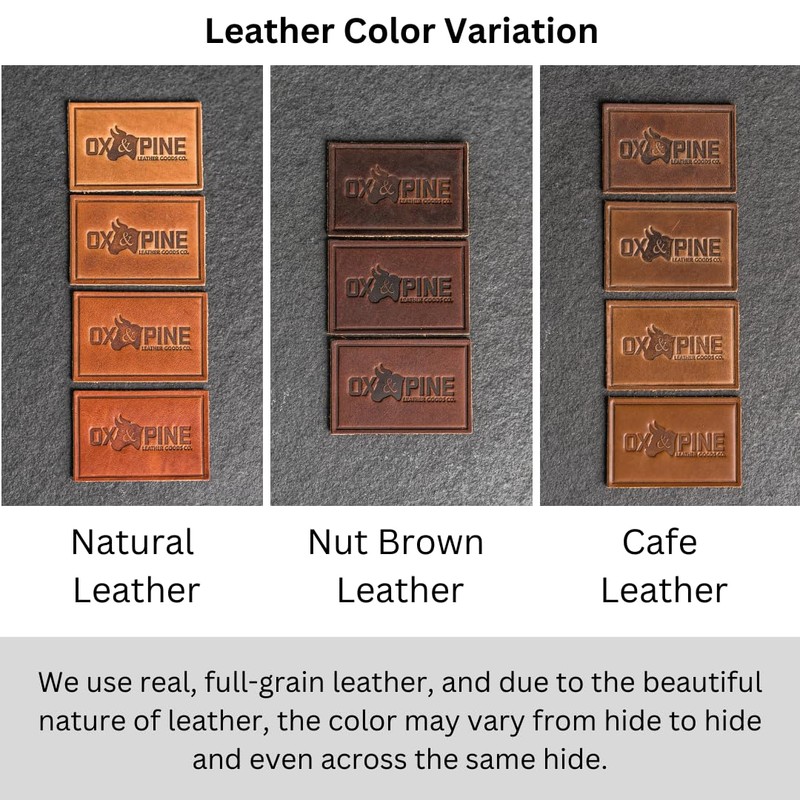Choose from our 8 leather colors: Nut Brown Dublin, Natural Dublin, Cafe, Rustic Brown, Saddle Tan, Dark Brown, Rustic Gray, and Black. Beautiful oil tanned leather - this is authentic cowhide leather, and part of the natural beauty and appeal is the variation from leather patch to leather patch (color and appearance)