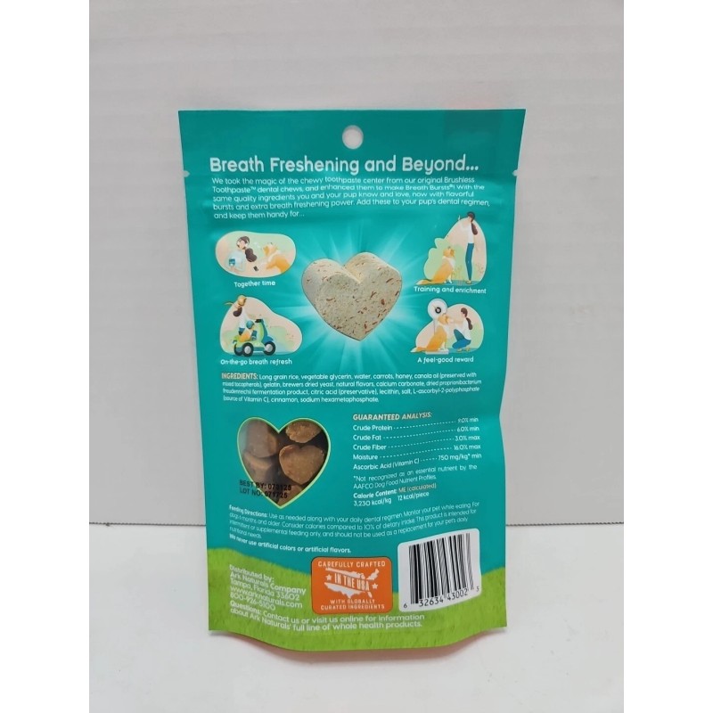 Introducing the ARK NATURALS Breath Bursts Brushless Toothpaste Dog Treats Bits in Cinnamon flavor, perfect for your furry friend's breath care needs. This toothpaste is suitable for all life stages.