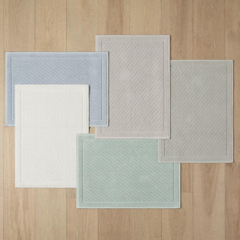 - MODERN BATH DECOR: Transform your home's style and comfort level with our durable woven cotton bath rugs and mats. This contemporary collection boasts 5 elegant colors, featuring tightly woven construction for longevity. Elevate your bathroom with these inviting bath mats and rugs. The spa-inspired palette offers Pearl White, soft grey, soothing eucalyptus green, creamy beige, and gentle baby blue. The fresh colors and distinctive multi-directional texture add charm to your bath decor.
