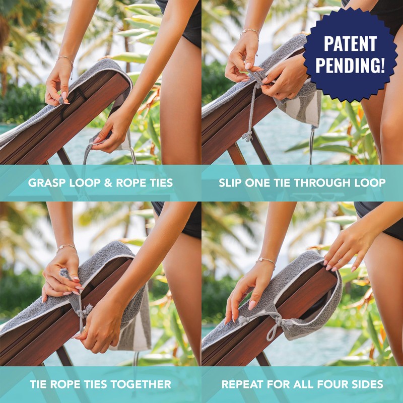 Experience beach days like never before with the innovative multi-purpose PATENT-PENDING Tie & Dry Beach Towel. Gone are the days of enjoying a relaxing swim, only to return to your chair to discover that your towel is in the sand! This beach towel is uniquely designed with strong rope ties and loops on each side, allowing you to easily secure it to your chair and enjoy uninterrupted relaxation or warm weather activities. SO DITCH THE CLIPS!